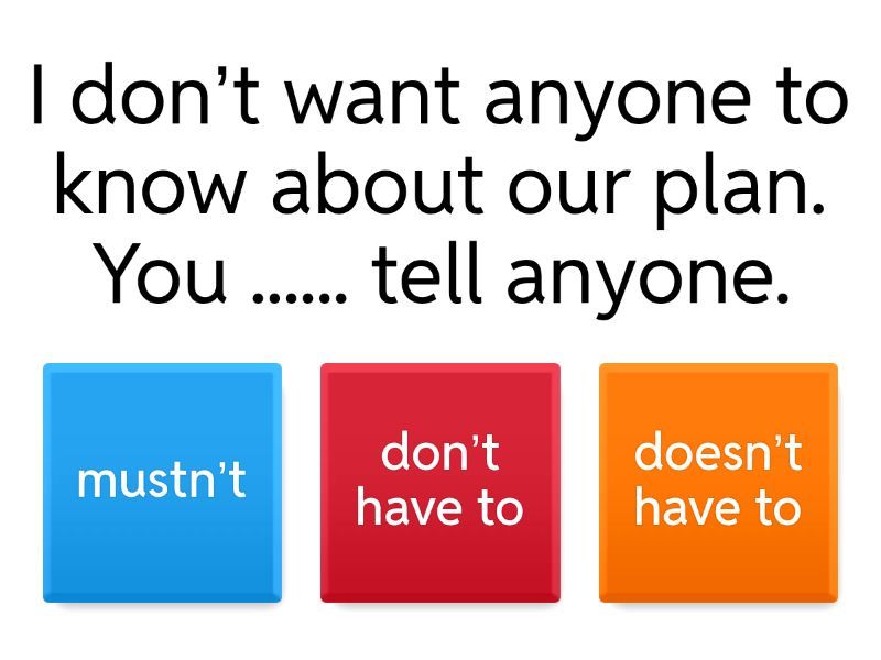 1) I don’t want anyone to know about our plan. You ...... tell anyone. a) mustn’t b) don’t have to c) doesn’t have to 2) Richard ....... wear a suit to work, but he usually does. a) mustn’t b) don’t have to c) doesn’t have to 3) There’s a lift in the building, so we ...... climb the stairs. a) mustn’t b) don’t have to c) doesn’t have to 4) I promised Kate I’d call her tomorrow. I ...... forget. a) mustn’t b) don’t have to c) doesn’t have to 5) I’m not very busy. I have a few things to do, but I ....... do them now. a) mustn’t b) don’t have to c) doesn’t have to 6) Sophie likes weekends because she .......... get up early. a) mustn’t b) don’t have to c) doesn’t have to 7) You ......... be a good player to enjoy a game of tennis. a) mustn’t b) don’t have to c) doesn’t have to 8) You should keep trying to find a job. You ........ give up. a) mustn’t b) don’t have to c) doesn’t have to 9) I ........... eat too much. I need to be on a diet. a) mustn’t b) don’t have to c) doesn’t have to 10) We have lots of time before our flight. We .......... check in yet. a) mustn’t b) don’t have to c) doesn’t have to 11) You ... buy your tickets in advance, but it’s usually cheaper. a) don't have to b) mustn't 12) It’s hot and sunny today, so you ... wear soem sunscreen a) must b) mustn't 13) What time do you ... get to the airport? a) have to b) must 14) Visitors ... follow the advice about safety. a) must b) mustn't 15) Tourists don’t ... to fly there. They can also travel by train. a) have b) have got 16) Let’s think of games we can play on the way. Travelling ... be boring! a) doesn't have to b) has to 17) I ... remember to take my swimsuit, because we’re going to the beach! a) must b) can 18) You ... like hot weather to go on holiday a) don't have to b) mustn't