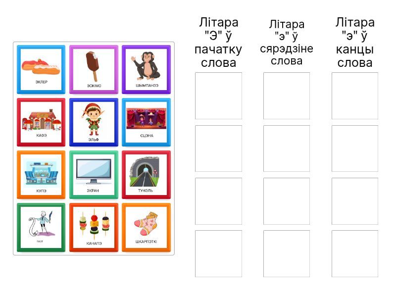 Літара "Э" ў пачатку слова: , , , , Літара "э" ў сярэдзіне слова: , , , , Літара "э" ў канцы слова: , , , ,