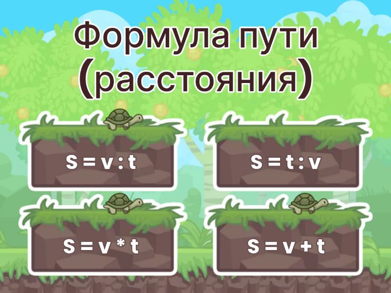 1) Формула пути (расстояния) a) S = v : t b) S = t : v c) S = v * t d) S = v + t 2) Формула времени a) t = S * v b) t = S - v c) t = v : S d) t = S : v 3) Формула скорости a) v = S * t b) v = S : t c) v = t : S d) v = S + t 4) Формула периметра прямоугольника a) P = (a + b) * 2 b) P = a + b c) P = a * b d) P = a : b 5) Формула площади прямоугольника a) S = a + b b) S = a * b c) S = 2 * (a + b) d) S = a : b 6) Формула стоимости a) C = p : n b) C = p * n c) C = n : p d) C = p - n 7) Формула длины окружности a) C = π : d b) C = d : π c) C = d * 2 d) C = π * d 8) Формула производительности (работы) a) p = A : t b) p = A * t c) p = A + t d) p = t : A 9) Формула для нахождения количества a) n = C * p b) n = p : C c) n = C : p d) n = C + p 10) Формула площади квадрата a) S = a + a b) S = a * a c) S = a * 4 d) S = a : 2