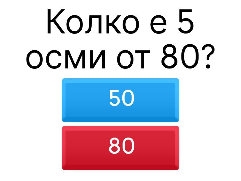 1) Колко е 5 осми от 80? a) 50 b) 80 2) Колко е 7 шести от 60? a) 60 b) 70 3) Колко е 5 двадесети и четвърти от 24? a) 120 b) 25 c) 24 d) 5 4) Измислих число Х. Увеличих го със сбора на дробите 4 осми и 5 осми, а после го разширих със 6 седми и получих 90 педесет и шести. Колко е х? a) 6 осми b) 7 осми c) 3 четвърти d) 14 шестнадесети 5) 2 тръби пълнели басейн за конкретно време. Първата сама го пълнела за 8 часа, а втората за 10 часа. Пълнели го 2 часа. Каква част е напълнена и каква остава? a) 20 часа b) 9 двадесети е напълнена и остават 11 двадесети c) 30 часа d) 10 часа 6) Работници жънат нива. Работели 2 дена. Единият сам може да я ожъне за 5 дни, а вторият за 8. Каква част за ожънали и каква им остава? a) 13 двадесети и остават 7 двадесети b) 3 десети и 7 десети c) 2 четиридесети и 38 четиридесети d) 5 тридесети и 25 тридесети