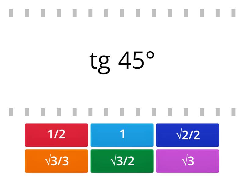 1 - tg 45°, 1/2 - cos 60°, √3/3 - tg 30°, √3/2 - sin 60°, √3 - tg 60°, √2/2 - sin 45°,