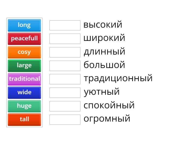 huge - огромный, large - большой, tall - высокий, wide - широкий, cosy - уютный, peacefull - спокойный, long - длинный , traditional - традиционный,