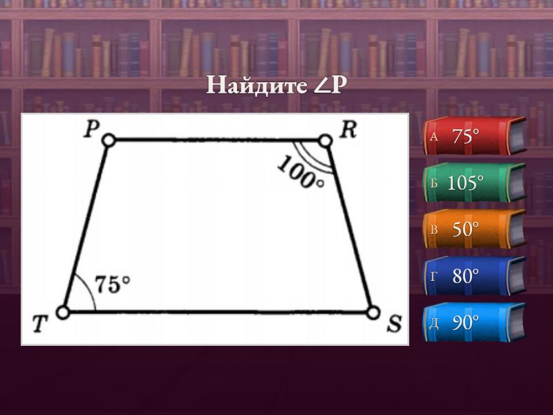 1) Найдите ∠B a) 110° b) 70° c) 50° d) 150° e) 90° 2) Найдите ∠P a) 75° b) 105° c) 50° d) 80° e) 90° 3) Найдите ∠F a) 65° b) 90° c) 115° d) 180° 4) Найдите ∠RMF a) 55° b) 90° c) 65° d) 35° 5) Найдите ∠B a) 60° b) 30° c) 120° d) 90° 6) Найдите ∠SMR a) 50° b) 65° c) 115° d) 25° 7) Найдите EF a) 3 b) 9 c) 12 d) 6 8) Найдите AB a) 5 b) 20 c) 30 d) 25 9) Найдите DC a) 50 b) 9 c) 21.5 d) 11 10) Найдите ∠1+∠2 a) 96° b) 51° c) 45° d) 264°