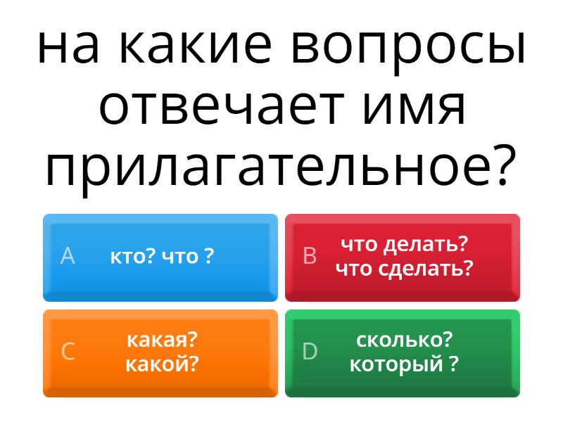 1) на какие вопросы отвечает имя прилагательное? a) кто? что ? b) что делать? что сделать? c) какая? какой? d) сколько? который ? 2) Выберите правильное словосочетание имени прилагательного a) Маша делает уроки b) Солнце светит c) Пять уток d) Красивая девушка 3) Вставьте пропущенное слово: Мальчик бегает по _____ траве a) Капризной b) Зеленой c) Деревянной d) Воздушной