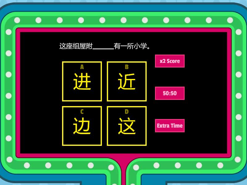 1) 这座组屋附________有一所小学。 a) 进 b) 近 c) 边 d) 这 2) 叔叔是这本书的作________。 a) 者 b) 都 c) 着 d) 看 3) 妹妹不在家,她去上演________课还没回来。 a) 医 b) 艺 c) 易 d) 意 4) 住在______近的邻居们都来给王爷爷过生日。 a) 付 b) 府 c) 附 d) 符 5) 妈妈下午出门前,已经准________好晚餐了。 a) 贝 b) 背 c) 备 d) 被 6) 花园里开满了________花,味道特别香。 a) 羊 b) 样 c) 鲜 d) 群 7) 小东在美食展上________到了很多美食,他很开心。 a) 尝 b) 常 c) 场 d) 长 8) 小美和妈妈晚上要去________夜市。 a) 进 b) 远 c) 退 d) 逛 9) 我们买完东西后,就去排队________钱。 a) 对 b) 过 c) 付 d) 附 10) 爷爷________到生日卡片后,心情很开心。 a) 改 b) 放 c) 收 d) 故 11) 爷爷傍晚都会去_________的公园散步。 a) 附近 b) 远近 c) 接近 d) 近来 12) 奶奶选好水果后,我们就去_________。 a) 打扫 b) 付钱 c) 争取 d) 听说 13) 这道题一点儿也_________康康,他很快就做出来了。 a) 对不起 b) 难不倒 c) 少不了 d) 了不起 14) 妈妈买了_________鲜花放在客厅里,非常美丽。 a) 一个 b) 一条 c) 一束 d) 一张 15) 小安的_________又坏了,只好拿去店里修。 a) 电脑 b) 脑袋 c) 大脑 d) 头脑 16) 姐姐有时去骑脚踏车,有时去_________美术馆。 a) 保护 b) 参观 c) 陪伴 d) 表演 17) 爷爷每天________晚都到楼下散步。 a) 榜 b) 旁 c) 滂 d) 傍 18) 哥哥和朋友们在楼下打________。 a) 求 b) 球 c) 救 d) 来 19) 图书馆离小美家很________,走五分钟就到了。 a) 近 b) 折 c) 听 d) 诉 20) 爷爷________到我们送的礼物,开心极了! a) 故 b) 放 c) 收 d) 改 21) 我家_________有公园,爷爷每天都去那里做运动。 a) 中间 b) 里面 c) 上面 d) 附近 22) 我把妈妈买回来的“福”字________在墙上。 a) 点 b) 店 c) 贴 d) 站 23) 晚上,国华正在________备明天上课要用到的文具。 a) 谁 b) 推 c) 难 d) 准 24) 同学们在________室里认真读书。 a) 果 b) 课 c) 颗 d) 棵 25) 妈妈今天________街时,给我买了一双鞋。 a) 选 b) 连 c) 遍 d) 逛 26) 我们明天请爷爷吃饭,_________去爷爷家给他庆祝生日,好吗? a) 后来 b) 自从 c) 已经 d) 或者 27) 奶奶把家里打________得干干净净。 a) 扫 b) 打 c) 扔 d) 把 28) 快迟到了,我加快________步往学校走去。 a) 脚 b) 腿 c) 服 d) 胖 29) 妈妈有很多事________要做,没空陪弟弟玩。 a) 请 b) 清 c) 情 d) 晴 30) 姐姐可以上书法课________者演艺课。 a) 成 b) 或 c) 减 d) 域 31) 小狗________在大卫的身后。 a) 跟 b) 眼 c) 很 d) 根 32) 爸爸十________就要从国外回来了,我真开心。 a) 只 b) 号 c) 兄 d) 员 33) 弟弟_________还在房间里玩游戏,现在怎么不在呢? a) 马上 b) 正在 c) 刚才 d) 总是 34) 丽丽要来家里做客,小青为她_________了一些水果。 a) 请求 b) 实现 c) 准备 d) 举行 35) 这本书是哪个_________写的呢? a) 读者 b) 作业 c) 作者 d) 老者