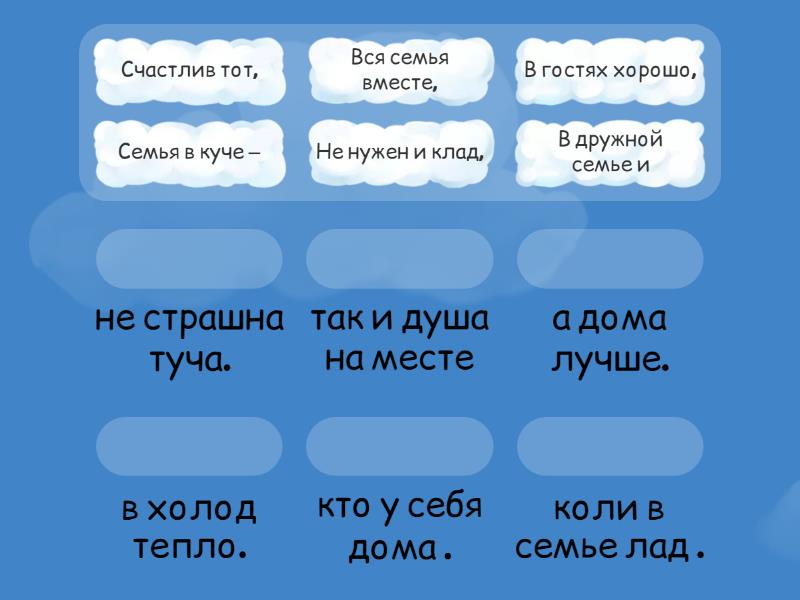 В гостях хорошо, - а дома лучше., Счастлив тот, - кто у себя дома ., Вся семья вместе, - так и душа на месте, Не нужен и клад, - коли в семье лад ., В дружной семье и - в холод тепло., Семья в куче – - не страшна туча.,