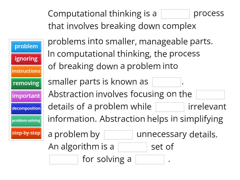 Computational thinking is a ____ process that involves breaking down complex problems into smaller, manageable parts. In computational thinking, the process of breaking down a problem into smaller parts is known as ____. Abstraction involves focusing on the ____ details of a problem while ____ irrelevant information. Abstraction helps in simplifying a problem by ____ unnecessary details. An algorithm is a ____ set of ____ for solving a ____ .