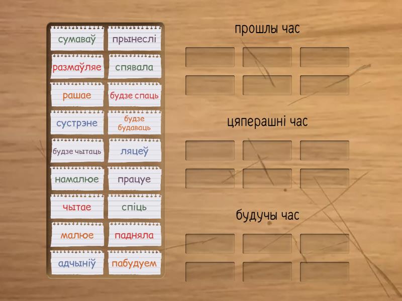 прошлы час: спявала, ляцеў, падняла, прынеслі, адчыніў, сумаваў, цяперашні час: спіць, чытае, працуе, малюе, размаўляе, рашае, будучы час: будзе спаць, сустрэне, пабудуем, намалюе, будзе будаваць, будзе чытаць,