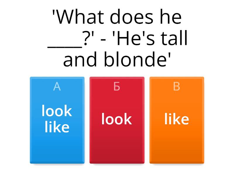 1) 'What does he ____?' - 'He's tall and blonde' a) look like b) look c) like 2) 'What is Suzy ___?' - 'She's really friendly' a) look like b) like c) be like 3) 'How is David feeling?' - 'I'm not sure, but he ___ sad' a) looks like b) looks 4) 'How old do you think those girls are?' - 'They ___ about 20' a) look b) look like c) be like 5) 'What do you think she does?' - 'She ____ an artist' a) looks b) looks like 6) 'How old is Louis's mum?' - 'I don't really know, but she ___ younger than her father. He is 63.' a) looks like b) looks 7) 'Who does she ___?' - 'Her dad. She has the same eyes' a) look like b) look c) like 8) 'What is that actor ___?' - 'He's really good. He can play any character' a) look like b) like c) look 9) What happened to her? She ___ angry. - I don't know, but you're right a) looks like b) looks c) like 10) What do they ___? - They're both tall and have curly hair. a) look like b) like c) look 11) What does he do? - He ___ a businessperson a) looks b) looks like c) likes 12) What city is in this photo? - It ___ New-York a) looks like b) looks c) like