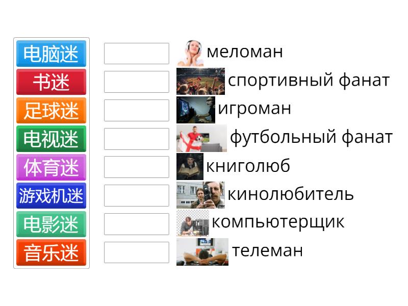 书迷 - книголюб, 电影迷 - кинолюбитель, 电脑迷 - компьютерщик, 体育迷 - спортивный фанат, 音乐迷 - меломан, 电视迷 - телеман, 游戏机迷 - игроман, 足球迷 - футбольный фанат,