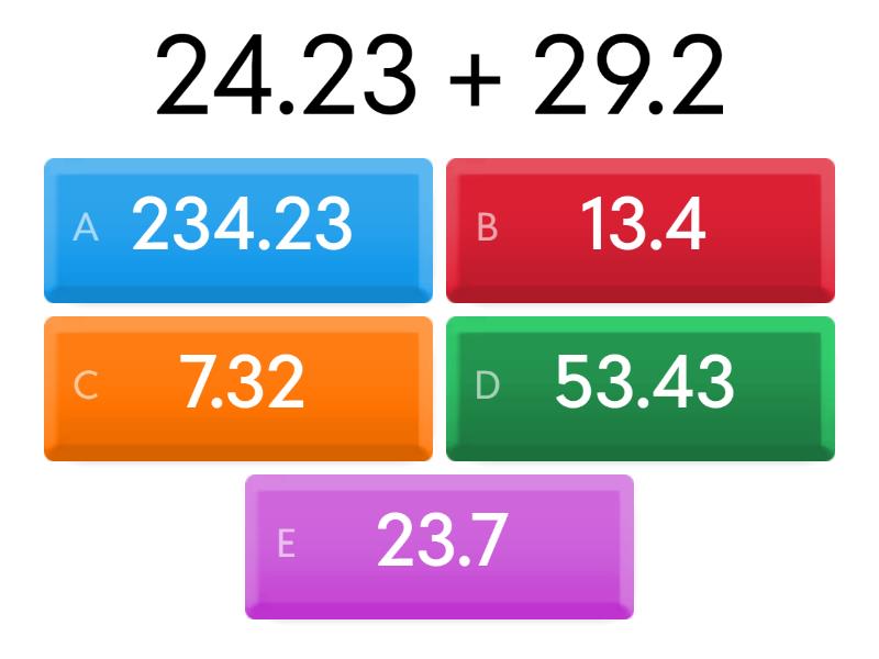 1) 24.23 + 29.2 a) 234.23 b) 13.4 c) 7.32 d) 53.43 e) 23.7 2) 3.5 - 2.7 a) 43.34 b) 1.2 c) 456.6 d) 0.80 e) 9.56 3) 243.34 + 23.24 a) 266.58 b) 212.56 c) 366.58 d) 24.8 4) 55.2 - 12.0 a) 34.2 b) 43.2 c) 56.2 d) 4.94 5) 3.4 + 54.7 a) 58.1 b) 123.3 c) 76.6 d) 143.4 6) 32 - 20.0 a) 234.3 b) 1.2 c) 23.7 d) 12 7) 68.2 - 5.66 a) 62.54 b) 55.54 c) 12.54 d) 52.54 8) 56.2 + 56.21 a) 0.01 b) 111.41 c) 112.41 d) 102.41 9) 52.9 - 9.0 a) 45.99 b) 66.7 c) 63.9 d) 43.9 10) 56.32 + 45.0 a) 195 b) 99.23 c) 101.32 d) 111.32