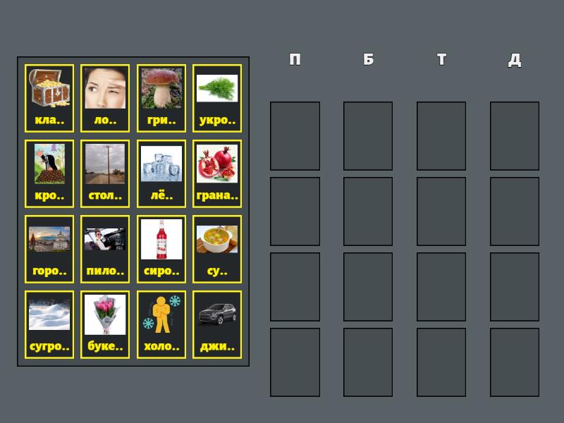 П: сиро.., укро.., су.., джи.., Б: сугро.., ло.., стол.., гри.., Т: кро.., буке.., грана.., пило.., Д: лё.., холо.., горо.., кла..,
