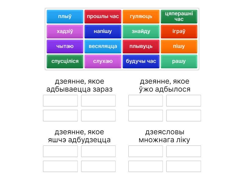 дзеянне, якое адбываецца зараз: цяперашні час, пішу, чытаю, слухаю, дзеянне, якое ўжо адбылося: прошлы час, плыў, іграў, хадзіў, дзеянне, якое яшчэ адбудзецца: будучы час, знайду, напішу, рашу, дзеясловы множнага ліку: весяляцца, плывуць, гуляюць, спусціліся,