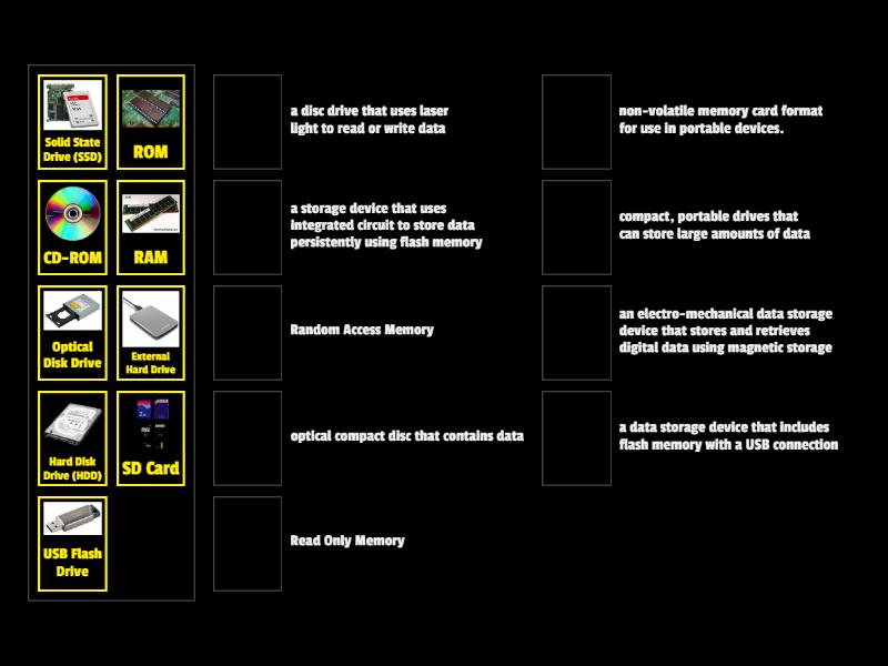 Hard Disk Drive (HDD) - an electro-mechanical data storage device that stores and retrieves digital data using magnetic storage, Optical Disk Drive - a disc drive that uses laser light to read or write data, Solid State Drive (SSD) - a storage device that uses integrated circuit to store data persistently using flash memory, USB Flash Drive - a data storage device that includes flash memory with a USB connection, SD Card - non-volatile memory card format for use in portable devices., External Hard Drive - compact, portable drives that can store large amounts of data, CD-ROM - optical compact disc that contains data, ROM - Read Only Memory, RAM - Random Access Memory,