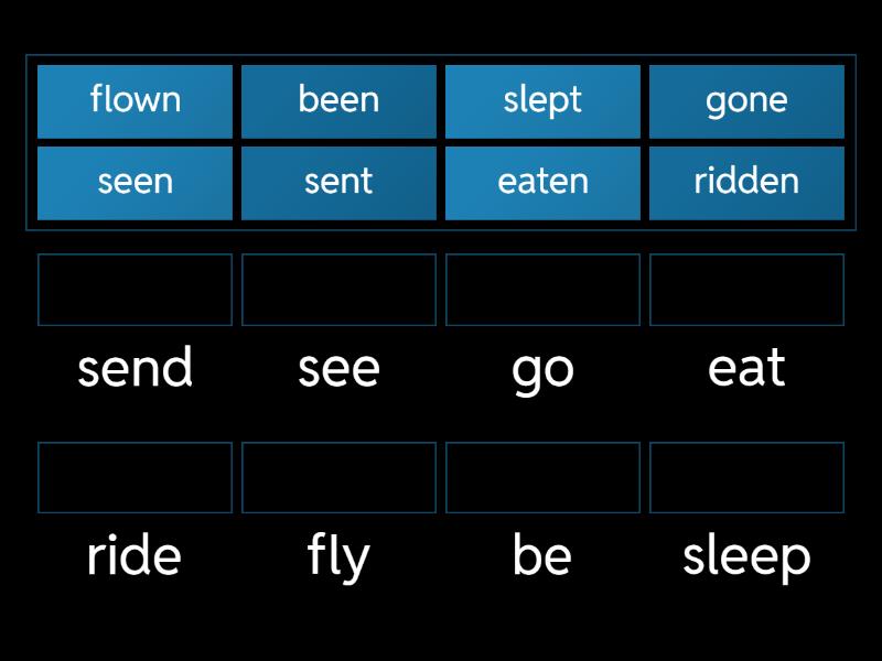 seen - see, sent - send, flown - fly, been - be, eaten - eat, slept - sleep, ridden - ride, gone - go,