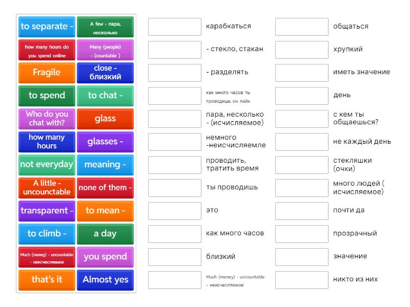 Fragile - хрупкий, transparent - - прозрачный, glass - - стекло, стакан, glasses - - стекляшки (очки), to climb - - карабкаться, meaning - - значение, to mean - - иметь значение, Almost yes - почти да, Many (people) - (countable ) - много людей ( исчисляемое), Much (money) - uncountable - неисчесляемое - Much (money) - uncountable - неисчесляемое, how many hours do you spend online - как много часов ты проводишь он лайн, a day - день, to separate - - - разделять, not everyday - не каждый день, close - близкий - близкий, none of them - - никто из них, to chat - - общаться, that's it - это, Who do you chat with? - с кем ты общаешься?, A little - uncounctable - немного -неисчисляемле, A few - пара, несколько - пара, несколько - (исчисляемое), how many hours - как много часов, you spend - ты проводишь, to spend - проводить, тратить время,