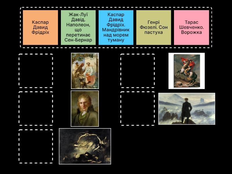 Жак-Луї Давід. Наполеон, що перетинає Сен-Бернар, Генрі Фюзелі. Сон пастуха, Каспар Давид Фрідріх. Мандрівник над морем туману, Каспар Давид Фрідріх, Тарас Шевченко. Ворожка,
