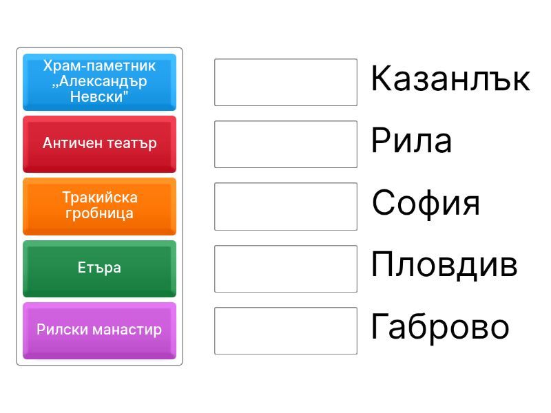 Храм-паметник ,,Александър Невски" - София, Античен театър - Пловдив, Тракийска гробница - Казанлък, Етъра - Габрово, Рилски манастир - Рила,