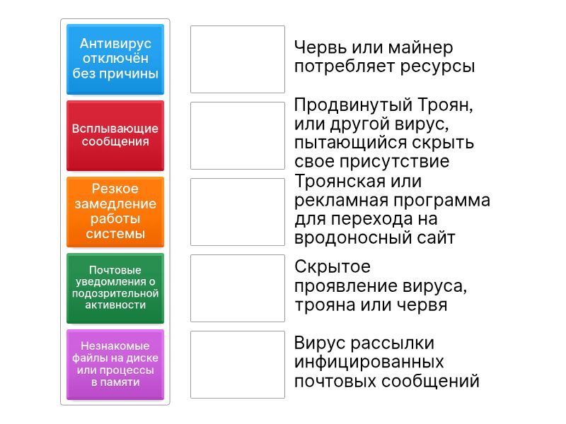 Всплывающие сообщения - Троянская или рекламная программа для перехода на вродоносный сайт, Резкое замедление работы системы - Червь или майнер потребляет ресурсы, Антивирус отключён без причины - Продвинутый Троян, или другой вирус, пытающийся скрыть свое присутствие, Почтовые уведомления о подозрительной активности - Вирус рассылки инфицированных почтовых сообщений, Незнакомые файлы на диске или процессы в памяти - Скрытое проявление вируса, трояна или червя,