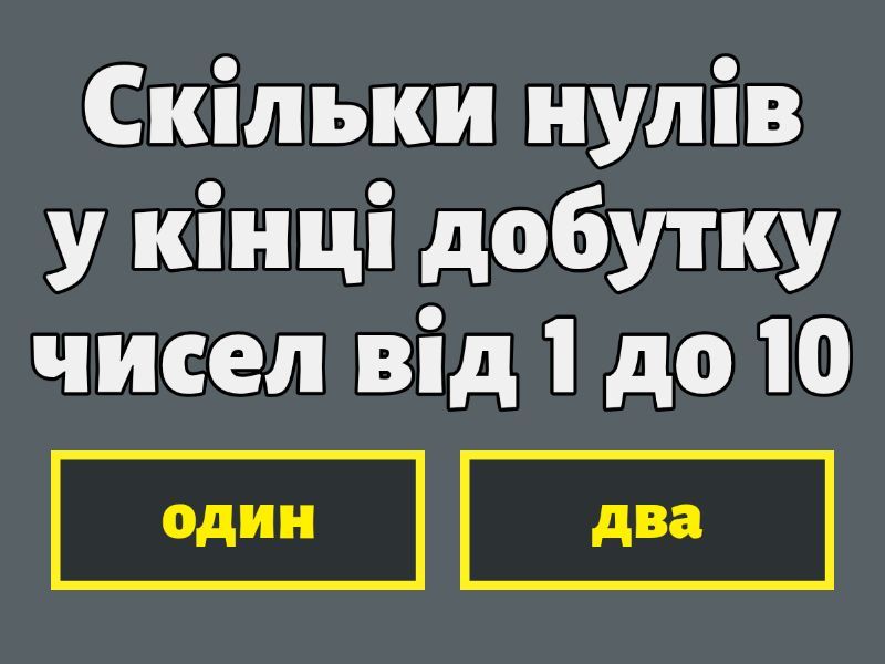 1) Скільки нулів у кінці добутку чисел від 1 до 10 a) один b) два 2) Скільки лап у двох павуків, трьох жуків, двох вужів і троьх чижів a) 40 b) 42 3) Скільки буде десятків, якщо два десятки помножити на два десятки a) 4 b) 14 c) 40 d) 400 4) задумане числа збільшили у 9 раз, потім зменшили в 9 раз, вийшло число 9. Яке число задумали? a) 9 b) 18 c) 27 d) 36 5) З Києва до Житомира вийшов потяг зі швидкістю 50 км⁄год, а з Житомир до Києва вийшов потяг зі швидкістю 60 км/год. Який з потягів буде далі від Житомира на момент зустрічі? a) перший потяг b) другий потяг c) на однаковій відстані d) не можливо визначити 6) Яке число потрібно збільшити в 12 раз і отримати 12 a) 0 b) 1 7) У кімнаті в кожному кутку сиділо по одному коту і кожний з цих котів бачив ще трьох котів. Скількив кімнаті було котів a) 12 b) 7 c) 4 d) 8 8) Яке число ділиться і на 2, на 5 і на 10 одночасно a) 2532 b) 2530 c) 5322 d) 5325 9) Трійка коней пробігла 30 км. Яку відстань пробіг кожень кінь a) 10 b) 20 c) 30 d) 90 10) У будинку 5 кімнат.З однієї зробили дві. Скільки стало кімнат? a) 4 b) 5 c) 6 d) 7 11) У сім'ї 6 братів. У кожного по сестрі.Скільки дітей в сім'ї ? a) 12 b) 10 c) 8 d) 7 12) У прямокутнику відрізали три кути.Скільки кутів залишилось? a) 1 b) 5 c) 4 d) 6 13) Горіло п'ять свічок. Дві з них згасли. Скільки свічок залишилось? a) 2 b) 3 c) 5 d) жодної 14) Скільки букв у числі 3 524 787 ? a) 9 b) жодної c) 12 d) 7 15) На заданих схемах зашифровані числа: СІНО- 7190, ПЕНЯ-8394. Вкажи число, що відповідає слову ПІСНЯ-? a) 89174 b) 17894 c) 81794 d) 18794