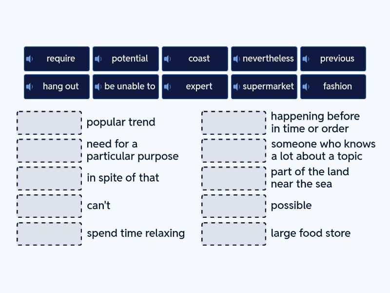 hang out - spend time relaxing, coast - part of the land near the sea, expert - someone who knows a lot about a topic, require - need for a particular purpose, nevertheless - in spite of that, fashion - popular trend, previous - happening before in time or order, supermarket - large food store, be unable to - can't, potential - possible,