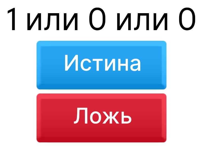 1) 1 или 0 или 0 a) Истина b) Ложь 2) Не ( 1 или 0) a) Истина b) Ложь 3) Не верно, что монитор - устройство ввода a) Истина b) Ложь 4) Не 0 или 1 a) Истина b) Ложь 5) 1 и 1 или 0 a) Истина b) Ложь 6) Принтер - устройство вывода информации и 4>7 a) Истина b) Ложь 7) Не (1 и 0) a) Истина b) Ложь 8) Не 1 и 0 a) Истина b) Ложь 9) 1 или не 1 a) Истина b) Ложь 10) Не (1 и 0) или 0 a) Истина b) Ложь