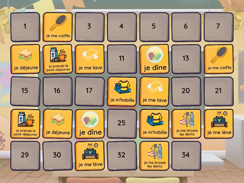 je me brosse les dents, je me coiffe, je déjeune, je me lève, je dîne, je me lave, je m'habille, je prends le petit-déjeuner, je sors de chez moi, je vais au collège en bus, je fais mes devoirs, je joue sur l'ordinateur, je regarde la télé, je me repose, je dors, je me douche, je rentre à la maison,
