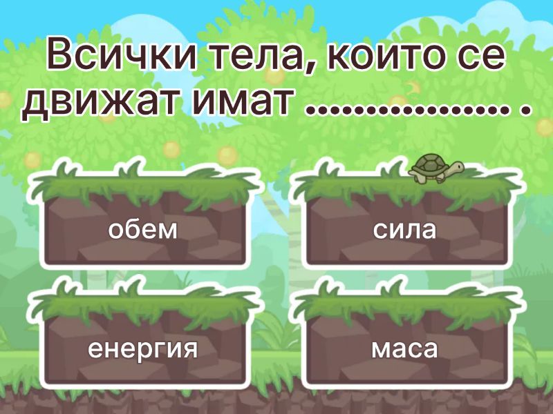 1) Всички тела, които се движат имат ................. . a) обем b) сила c) енергия d) маса 2) Електрическата енергия може да се .............. от един вид в друг. a) абсорбира b) прехвърля c) превръща d) измерва 3) Когато включим котлона, той се ............... и електрическата енергия се превръща в .............. . a) нагрява b) охлажда  c) загрява  d) друго e) топлинна f) слънчева 4) Ветрогенераторите използват енергията на .................... , за производство на електричество. a) въглищата  b) слънцето  c) вятъра d) водата 5) ...................... се строи близо до язовир, защото в тях се използва енергията на ................... . (2 отговора) a) Централа b) ВЕЦ (Водна електрическа централа) c) вятъра d) водата 6) Лампата превръща електрическата енергия в ................. . a) светлина b) топлинна c) светлинна d) мускулна 7) ............................ енергия е екологично чиста, но е много скъпа и недостатъчна да покрие нуждите на населението. a) Естествената b) Растителната c) Водната d) Слънчевата