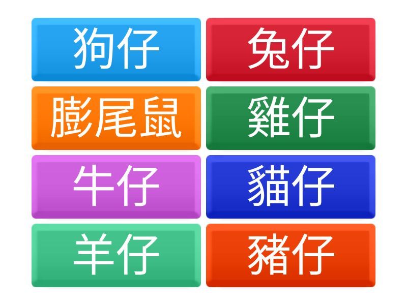 牛仔 - ngiuˇ eˋ, 豬仔 - zuˊ eˋ, 雞仔 - gieˊ eˋ, 兔仔 - tu eˋ, 膨尾鼠 - pong miˊ cuˋ, 羊仔 - iongˇ eˋ, 狗仔 - gieuˋ eˋ, 貓仔 - meu eˋ,