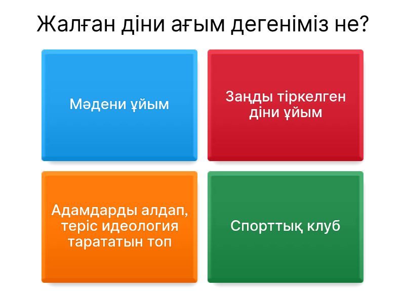 1) Жалған діни ағым дегеніміз не? a) Мәдени ұйым b) Заңды тіркелген діни ұйым c) Адамдарды алдап, теріс идеология тарататын топ d) Спорттық клуб 2) Жалған діни ағымдардың басты мақсаты қандай? a) Адамдарға тегін білім беру b) Қоғамда татулық орнату c) Спорттық шаралар өткізу d) Адамдарды өз ықпалына алу 3) Жалған ағым өкілдері көбіне қандай әдісті қолданады? a) Сенімге кіріп жалған уәде беру b) Сыйлық тарату c) Адал сауда жасау d) Тек ресми кездесулерге келу 4) Жалған діни ағымдардан қорғанудың ең тиімді жолы? a) Бейтаныс адамдармен кез келген кездесуге бару b) Ақпаратты ресми дереккөзден тексеру c) Кез келген ұсынысты қабылдау d) Әлеуметтік желіден бәріне сену 5) Егер біреу діни мазмұндағы күмәнді ақпарат ұсынса, не істеу керек? a) Бірден қосылу b) Достарға тарату c) Елемеу d) Үлкендерден немесе мамандардан кеңес сұрау