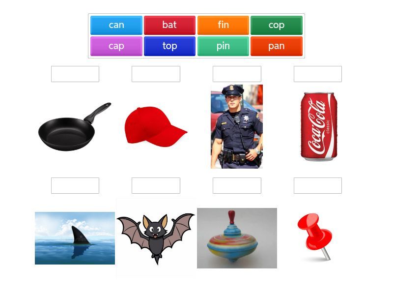 bat, dig, mop, top, cop, map, pig, cab, pin, fin, pan, fat, can, cat, cap, fan,