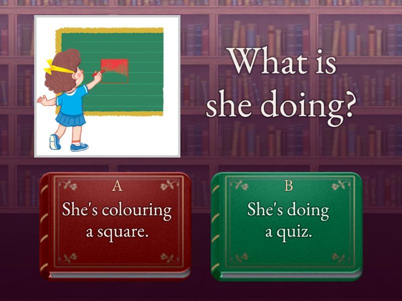1) What is she doing? a) She's colouring a square. b) She's doing a quiz. 2) What is he doing? a) He's colouring a square. b) He's doing a quiz. 3) What is she doing? a) She's answering a question. b) She's doing a quiz. 4) She is a) colouring a square. b) doing a quiz. 5) He is  a) colouring a square. b) doing a quiz. 6) She is a) answering a question.  b) doing a quiz. 7) She is answering a ............... a) question b) square 8) She is coloring a ............... a) question b) square 9) Is there a ......? a) box b) fox 10) Is there a ......? a) box b) fox 11) Is there an ......? a) box b) ox 12) Pass me the .......... a) jelly b) jam 13) Pass me the .......... a) jelly b) jam 14) Pass me the .......... a) juice b) jam