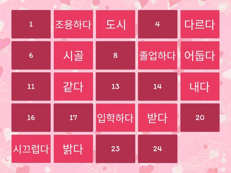 입학하다 - 졸업하다, 도시 - 시골, 시끄럽다 - 조용하다, 내다 - 받다, 같다 - 다르다, 어둡다 - 밝다, 길다 - 짧다, 높다 - 낮다, 화려하다 - 단순하다, 나이가 많다 - 어리다, 크다 - 작다, 싸다 - 비싸다,