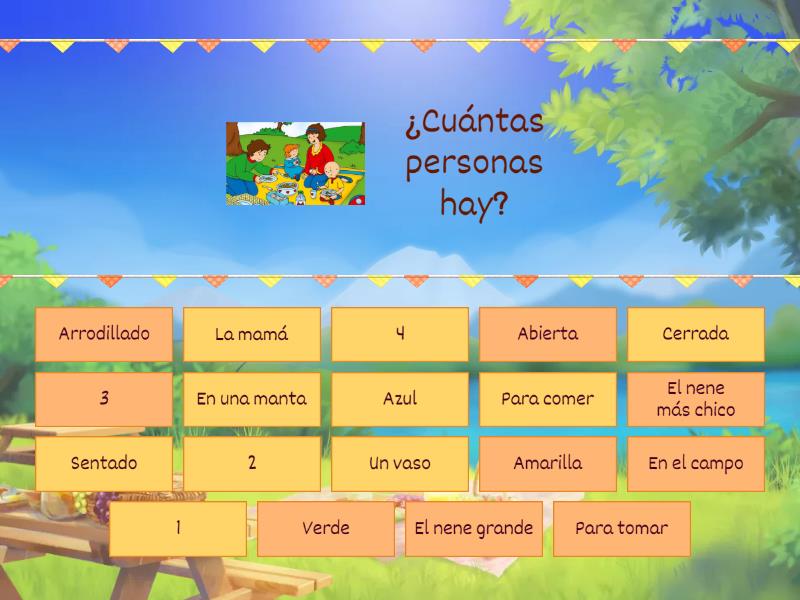 4 - ¿Cuántas personas hay?, En el campo - ¿En qué lugar están?, En una manta - ¿En dónde están apoyados?, Amarilla - ¿De qué color es la manta?, 2 - ¿Cuántas mujeres hay?, El nene más chico - ¿Quién es pelado?, La mamá - ¿Quién tiene vincha?, El nene grande - ¿Quién se está sirviendo comida?, Un vaso - ¿Qué tiene la nena en la mano?, Para tomar - ¿Para qué sirve un vaso?, Para comer - ¿Para qué sirve la comida?, Verde - ¿De qué color es el moño del zapato de la mamá?, Azul - ¿De qué color es el pantalón del nene más chico?, Abierta - ¿Cómo tiene la boca la mamá?, Cerrada - ¿Cómo tiene la boca la nena?, Arrodillado - ¿Cómo está el nene grande?, Sentado - ¿Cómo está el nene chico?, 3 - ¿Cuántas personas tienen pantalón?, 1 - ¿Cuántas personas son peladas?,