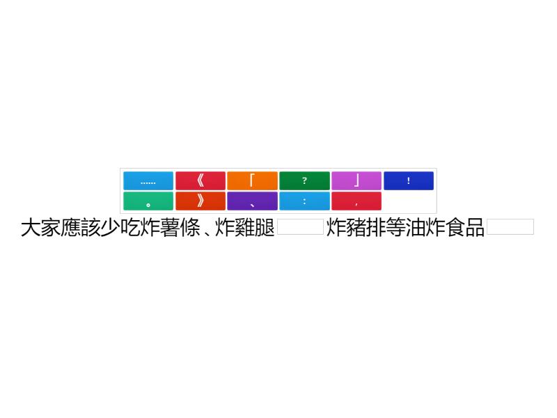 大家應該少吃炸薯條 、 炸雞腿____炸豬排等油炸食品____ 爸爸對我說 ____ ____ 星期天我們一起去探望奶奶吧 ____ ____ 我問媽媽 ____ ____ 做完功課可以出去玩嗎 ____ ____ 今天,老師教我們認識了很多象形字____例如:馬____牛、羊____ 爸爸告訴我____唐伯虎是我國古代著名的畫家,他的畫價值連城____ 看過____木偶奇遇記____之後____我被精彩的故事情節深深吸引住了____ 哥哥神氣地對弟妹說 ____ ____ 我來給你們講 ____ 龜兔賽跑 ____的故事 ____ ____ 我和文文是好朋友,他有困難 ____我怎可以不幫忙呢 ____ 因為我在香港出生 , 在香港成長 ____ 所以這裏就是我的家鄉____ 他小時候只顧玩樂____現在才明白____書到用時方恨少____的道理____ 所謂____不聽老人言____吃虧在眼前。____你要聽聽人家的勸告啊 ____ 海瑩改戴隱形眼鏡後____再沒有人叫她____四眼妹____了____ 李志傑説:____你沒有聽過____人不可貌相____水不可斗量____這句話嗎﹖____