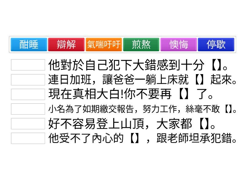 辯解 - 現在真相大白!你不要再【】了。, 煎熬 - 他受不了內心的【】,跟老師坦承犯錯。, 停歇 - 小名為了如期繳交報告,努力工作,絲毫不敢【】。, 酣睡 - 連日加班,讓爸爸一躺上床就【】起來。, 懊悔 - 他對於自己犯下大錯感到十分【】。, 氣喘吁吁 - 好不容易登上山頂,大家都【】。,