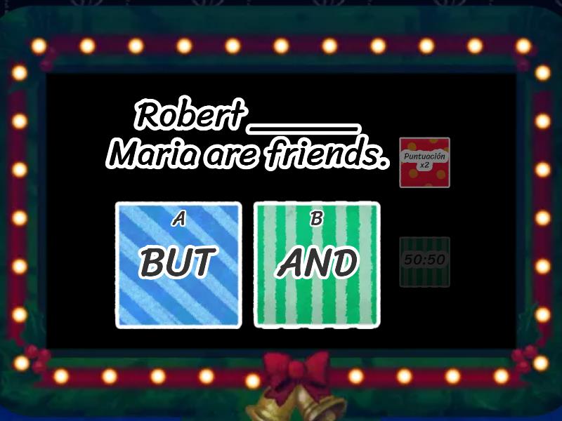 1) Robert ______ Maria are friends. a) BUT b) AND 2) I want to ______ I can’t. a) AND b) BUT 3) The dog runs ______ jumps. a) AND b) BUT 4) The car is beautiful ______ to big. a) BUT b) AND 5) He likes cats _____ he is afraid. a) BUT b) AND 6) Omar ______ Diego eat pizza. a) BUT b) AND 7) I like to eat cakes ______ cookies. a) AND b) BUT 8) I want to play outside ______ it’s raining. a) AND b) BUT 9) Cats ______ dogs are good friends. a) BUT b) AND 10) María is going ______ Pedro is not. a) BUT b) AND