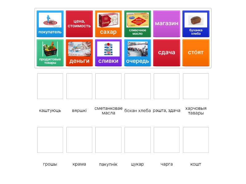 магазин - крама, покупатель - пакупнік, деньги - грошы, цена, стоимость - кошт, сто́ят - каштуюць, сдача - рэшта, здача, очередь - чарга, продуктовые товары - харчовыя тавары, буханка хлеба - бохан хлеба, сливки - вяршкі, сливочное масло - сметанковае масла, сахар - цукар,
