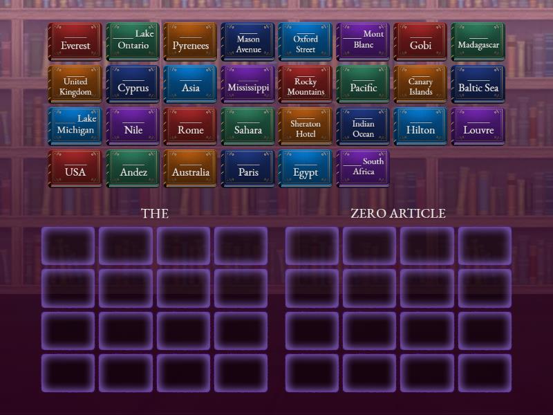THE: ____ Mississippi, ____ Pacific, ____ Baltic Sea, ____ Rocky Mountains, ____ Andez, ____ Canary Islands, ____ USA, ____ United Kingdom, ____ Sahara, ____ Gobi, ____ Nile, ____ Indian Ocean, ____ Pyrenees , ____ Sheraton Hotel, ____ Louvre , ____ Hilton, ZERO ARTICLE: ____ Egypt, ____ South Africa, ____ Australia, ____ Rome, ____ Oxford Street, ____ Mont Blanc , ____ Lake Ontario, ____ Cyprus, ____ Asia, ____ Mason Avenue, ____ Everest, ____ Lake Michigan , ____ Madagascar , ____ Paris,