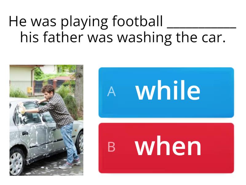 1) He was playing football ___________ his father was washing the car. a) while b) when 2) They were doing a picnic in the park ______ the rain started! a) while b) when 3) I _____________ while my mother _________________ the dinner. a) was studying / cooked b) studied / cooked c) was studying / was cooking 4) I _________ a horror movie when my brother _________ me. a) was watching / scared b) was watching / was scaring c) watched / scared 5) I was walking my dog _______ a cat appeared. a) when b) while 6) She was sleeping ________ the phone rang. a) while b) when 7) I ____________ attention while the teacher_____________. a) wasn't paying / spoke b) wasn't paying / was speaking c) payed / spoke 8) I was doing my homework ______ my dog barked loudly. a) while b) when 9) He ______________ tennis while we _____________ playing hockey. a) was playing / played b) played / played c) was playing / were playing 10) I ________ TV when the lights ________ out. a) watched / went b) was watching / were going c) was watching / went