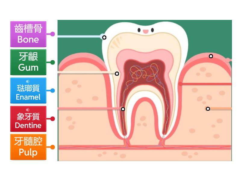 琺瑯質 Enamel, 象牙質 Dentine, 牙髓腔 Pulp, 牙齦 Gum, 齒槽骨 Bone.