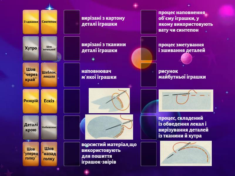 Хутро - ворсистий матеріал,що використовують для пошиття іграшок-звірів, Синтепон - наповнювач м’якої іграшки, Розкрій - процес, складений із обведення лекал і вирізування деталей із тканини й хутра, Ескіз - рисунок майбутньої іграшки, Шаблон, лекало - вирізані з картону деталі іграшки, Деталі крою - вирізані з тканини деталі іграшки, З’єднання - процес зметування і зшивання деталей, Набивання - процес наповнення об’єму іграшки, у якому використовують вату чи синтепон, Шов “уперед голку”, Шов “назад голку, Шов “через край”, Шов “петельний”,