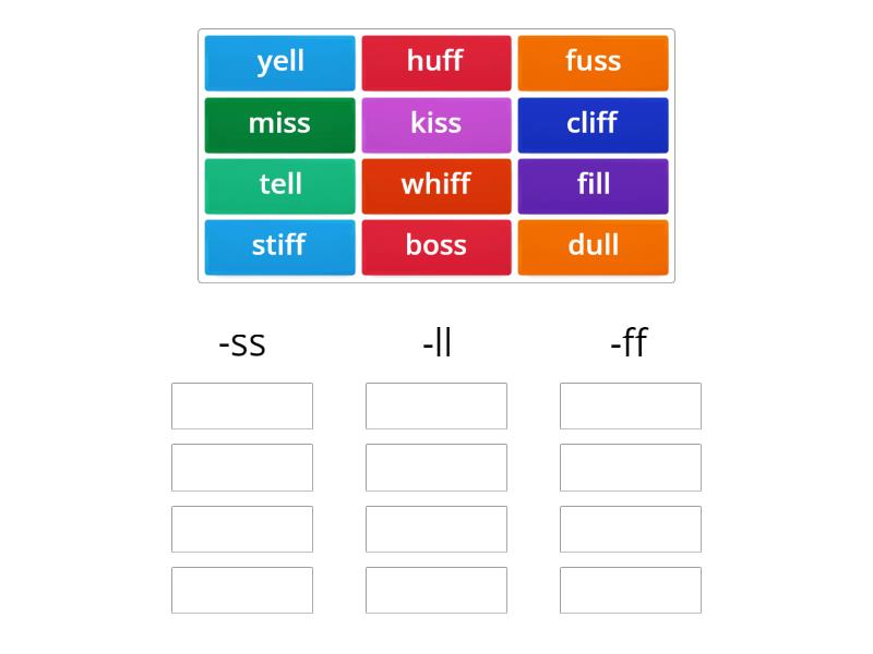 -ss: miss, fuss, kiss, boss, -ll: fill, tell, yell, dull, -ff: cliff, huff, whiff, stiff,