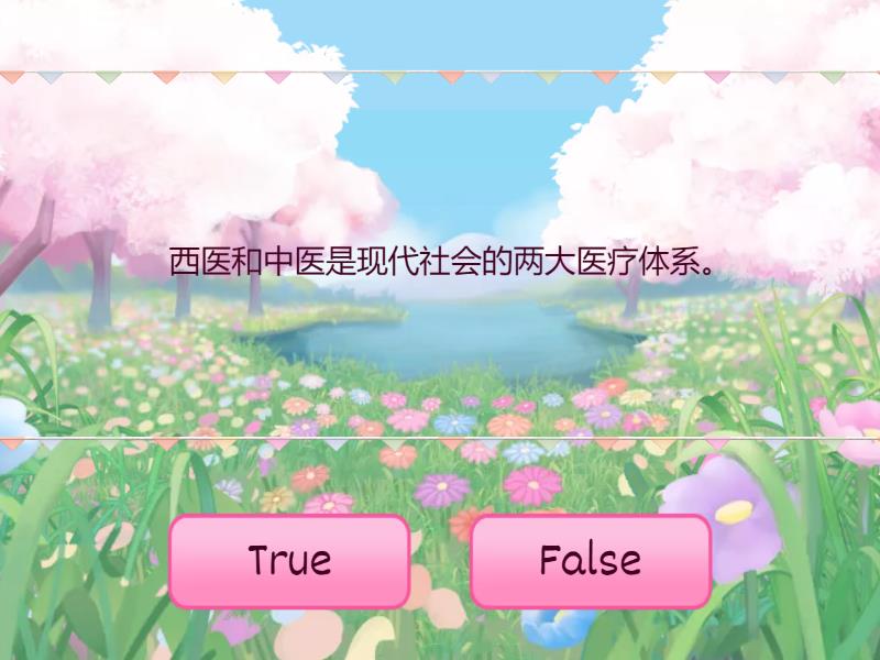 True: 西医和中医是现代社会的两大医疗体系。, 治疗慢性病,中医可能比西医效果好。, 中医认为:人生病的原因是身体的阴阳失衡。, 中医理论的两个基本模型是:“阴阳” 和“五行”。, 属阴的脏器包括:肝、心、脾、肺、肾, 属阳的脏器包括:胆、小肠、胃、大肠、膀胱, 西医重在治疗疾病,中医重在保持健康不生病。, 中药有一千多种草药,也有动物和矿物入药。, 每一贴中药都如一支军队,由君、臣、佐、使四种功能的药物配伍而成。, 一贴药里,只能有一种君药。, 佐药是为了防止君药引起的副作用。, 臣药从各个方面帮助君药,可以有好几种。, False: 中医看病需要用听诊器,体温表等设备。, 中医认为:肺炎的原因是身体里面有细菌或病毒。, 中医认为:阴阳分离,人就生病了。, 五行相克的顺序是:木火土金水, 西医是通过调理脏器之间的关系,来帮助身体进行自我修复的。, 中药都是植物草药。, 中药的味道都是甜的。, 中药是先用文火煮沸,再用武火慢熬。,