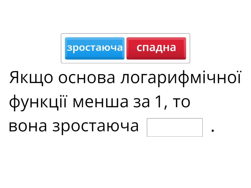 Якщо основа логарифмічної функції менша за 1, то вона зростаюча ____ . Областю визначення логарифмічної функції є множина ____ чисел. Областю значень логарифмічної функції є множина ____ чисел. Графік логарифмічної функції завжди проходить через точку ____ Вісь ____ є асимптотою показникової функції.
