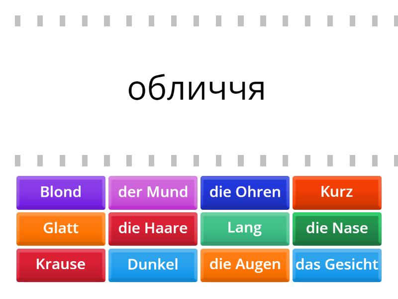 das Gesicht - обличчя, die Haare - волосся, die Augen - очі, die Nase - ніс, der Mund - рот, die Ohren - вуха, Lang - довгий, Kurz - короткий, Blond - світлий, Dunkel - темний, Krause - кучерявий, Glatt - рівний,