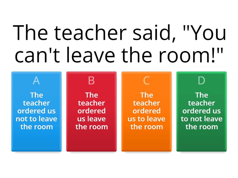 1) The teacher said, "You can't leave the room!" a) The teacher ordered us to leave the room b) The teacher ordered us not to leave the room c) The teacher ordered us leave the room d) The teacher ordered us to not leave the room 2) Dad, “Don’t take my car!” a) Dad told me to take his car b) Dad told me not take his car c) Dad told me not to take his car d) Dad told me not to take my car 3) Teacher, “Don't make noise!” a) The teacher told us don't make noise b) The teacher told us not to make noise c) The teacher told not to make noise 4) Steven, “Hurry up!” a) Steven told me hurry up b) Steven told me hurrying up c) Steven told me to hurry up d) Steven told me not to hurry up 5) Sarah, “Don't text me!” a) Sarah told me don't text her b) Sarah told me not to text her c) Sarah told me not text her d) Sarah told not to text her 6) Scott, “Answer my question!” a) Scott told me answer my question b) Scott told me to answer my question c) Scott told me to answer his question d) Scott told me to answer their question 7) Alexander, “Don't swim in that river!” a) Alexander told me not swim in that river b) Alexander told no to swim in that river c) Alexander told me not to swim in that river d) Alexander told me to swim in that river 8) “Everybody form a line!” he said. a) He told to form a line. b) He told us forming a line. c) He told us to form a line. 9) “Talk to Jen about it,” Zak said. a) Zak told me to talk about it. b) Zak told me to talk to Jen about it. c) Zak told me not to talk to Jen about it. 10) “Jason, turn right,” Sarah said. a) Sarah told Jason to turn right. b) Sarah told to turn right. c) Sarah told turning right.