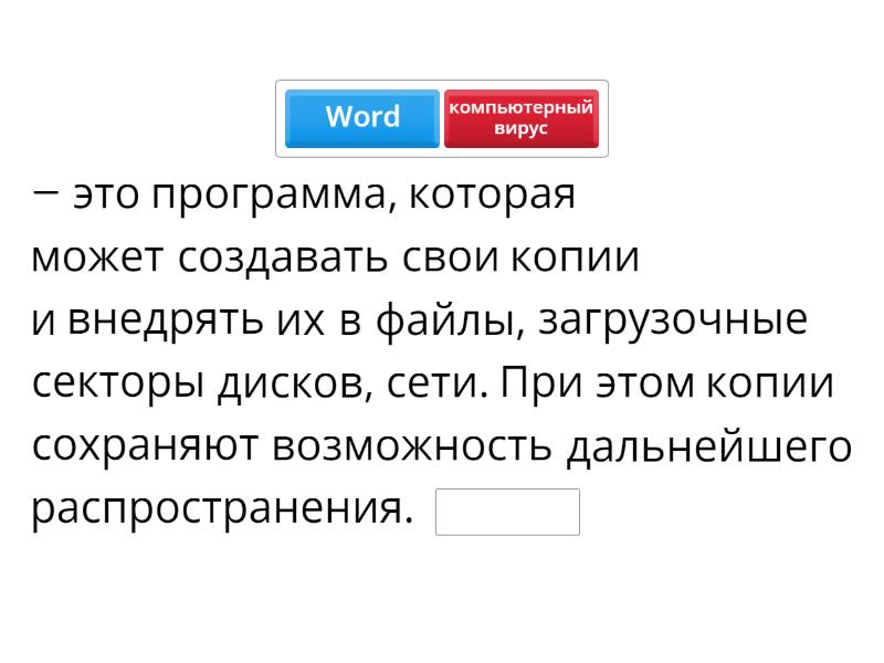 – это программа, которая может создавать свои копии и внедрять их в файлы, загрузочные секторы дисков, сети. При этом копии сохраняют возможность дальнейшего распространения. ____ Человек, который «пишет» вирусы называет себя ____ – оказывают незначительное влияние на работу ПК, занимая часть системных ресурсов. Нередко пользователи даже не подозревают об их присутствии. ____