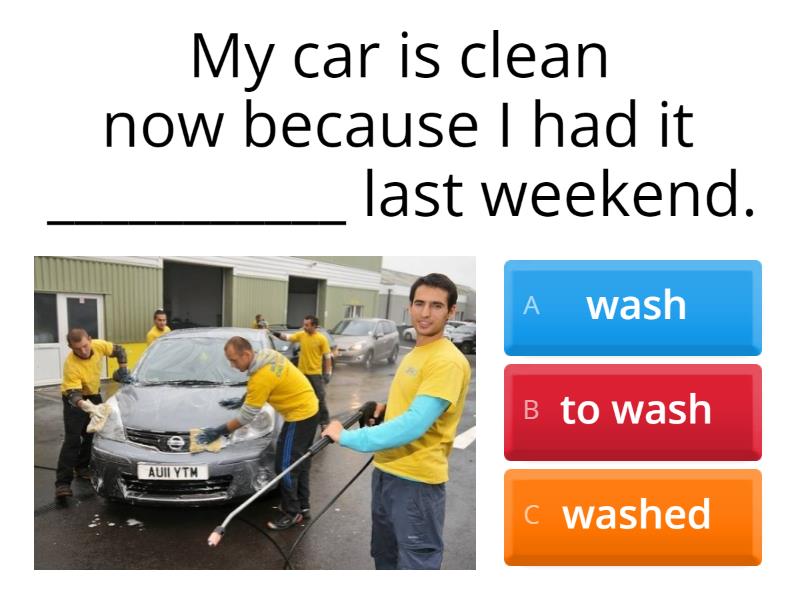 1) My car is clean now because I had it ___________ last weekend. a) wash b) to wash c) washed 2) My computer broke down last week. Therefore, I got someone ___________ it yesterday. a) fix b) to fix c) fixed 3) My father got his bike _____________ last weekend. a) repaired b) to repair c) repair 4) My teacher usually ____________ her helper to erase the board. a) had b) gets c) to have 5) My house needs painting. I think, I'll have _____________ painted next week. a) someone b) it c) anyone 6) My little brother ___________ his hair cut right now. a) is having b) has c) had 7) My friend usually gets _________________his bedroom. a) his mother clean b) his mother to clean c) his mother cleaning 8) I got my tooth ______________ yesterday. a) filled b) fill c) to fill 9) I ________________my nails done two days ago. a) am getting b) got c) getting 10) My son will have his bedroom __________________ next week. a) to decorate b) decorated c) decorating 11) In my job, I always have my car _________________. a) park b) parked c) to park 12) From time to time, I get someone _____________ the grass in my garden a) mow b) to mow c) mowed