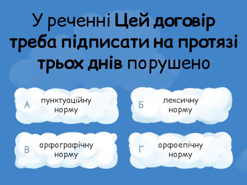 1) (1)Чотирнадцятого (2)листопада трапився курйозний (3)випадок: (4)мережа магазинів (5)«Решето» продала покупцям цілий (6)центнер (7)курятини всього за (8)сімдесят гривень, про що свідчив (9)виразний (10)цінник. У всіх словах якого рядка порушено акцентуаційну норму? a) 1, 3, 6, 8 b) 1, 4, 7, 10 c) 2, 3, 6, 9 d) 2, 4, 5, 10 2) Лексична помилка є в рядку: a) розв’язувати задачу b) уникнути небезпеки c) заказати букет квітів d) перекладати болгарською 3) Виберіть рядок, у якому є граматична (синтаксична) помилка. a) Читаючи книгу, блискавка вдарила в скелю. b) Відповідаючи на запитання, він відволікався. c) Завершивши навчання, вона влаштувалася на роботу. d) Відвідуючи батьків, ми щоразу згадуємо дитинство. 4) Позначте рядки, де порушено мовну норму. a) приймати участь b) здавати іспит c) спільна справа d) багаточисельні дзвінки e) наступного разу 5) Позначте рядки, де порушено акцентуаційну мовну норму. a) чорнослИв b) спинА c) рАзом d) несЕмо e) фОльга 6) Сукупність мовних засобів, які визнані правильними, ба більше — зразковими на певному історичному етапі, має назву a) мовне правило b) мовний факт c) мовна норма d) мовне кліше 7) Акцентуаційні норми фіксують a) орфоепічні словники та словники наголосів b) перекладні та орфоепічні словники c) фразеологічні та тлумачні словники d) частотні словники та словники синонімів 8) Неправильний розділовий знак у реченні Мотивація, це важливо для кожного є порушенням a) пунктуаційної норми b) лексичної норми c) орфографічної норми d) орфоепічної норми 9) Наголошування останнього складу в слові чорнозЕм є порушенням a) пунктуаційної норми b) лексичної норми c) орфографічної норми d) орфоепічної норми 10) Написання півкнижки є порушенням a) пунктуаційної норми b) лексичної норми c) орфографічної норми d) орфоепічної норми 11) У сполученні слів приймати участь порушено a) пунктуаційну норму b) лексичну норму c) орфографічну норму d) орфоепічну норму 12) У реченні У політиці потрібно по справжньому змагатися реальними программами порушено a) пунктуаційну та лексичну норми b) лексичну та орфографічну норми c) дві орфографічні норми d) орфоепічну та лексичну норми 13) У реченні Відео-реєстратори — це прилади, які використовують для запису, збереження й відтвореня відео порушено a) пунктуаційну та лексичну норми b) лексичну та орфографічну норми c) дві орфографічні норми d) орфоепічну та лексичну норми 14) У реченні Цей договір треба підписати на протязі трьох днів порушено a) пунктуаційну норму b) лексичну норму c) орфографічну норму d) орфоепічну норму